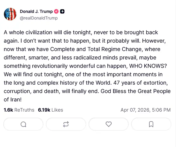 امریکا کے صدر ڈونلڈ ٹرمپ نے ایران کو دھمکی دی ہے کہ آج رات ایک پوری تہذیب ختم ہوسکتی ہے اور انہوں نے اس لمحے کو دنیا کی طویل اور پیچیدہ تاریخ کے اہم ترین لمحات میں سے ایک قرار دیا ہے۔