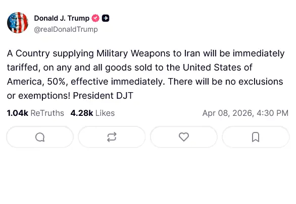 امریکی صدر نے کہا کہ جو بھی ملک ایران کو فوجی ہتھیار فراہم کرے گا، اس کی امریکا کو برآمد کی جانے والی تمام اشیا پر فوری طور پر 50 فیصد ٹیرف عائد ہوگا، یہ ٹیرف فوری طور پر عائد کیا جائے گا اور اس میں کسی قسم کی کوئی چھوٹ یا استثنیٰ نہیں ہوگا۔