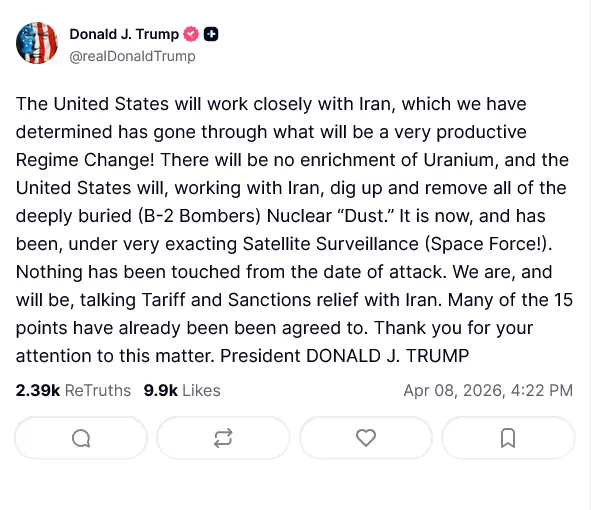 امریکا اور ایران کے درمیان جنگ بندی پر عملدرآمد شروع ہو گیا ہے اور امریکا کا پہلا جہاز بھی آبنائے ہرمز سے روانہ ہو چکا ہے۔ بدھ کے روز اپنے سوشل میڈیا پلیٹ فارم سوشل ٹروتھ پر جاری بیان میں صدر ٹرمپ نے کہا کہ ایران کو اسلحہ کرنے والے ممالک پر ٹیرف عائد کریں گے۔