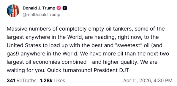 سماجی رابطے کی ویب سائٹ ٹروتھ سوشل پر جاری بیان میں ڈونلڈ ٹرمپ نے کہا کہ ’دنیا کے سب سے بڑے ٹینکرز (بحری جہاز) اعلیٰ معیار کے تیل اور گیس کے حصول کے لیے امریکا کی طرف رواں دواں ہیں‘۔