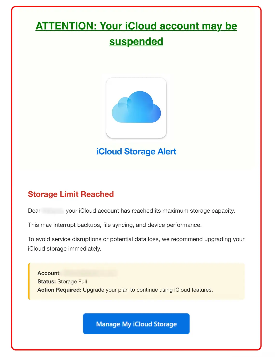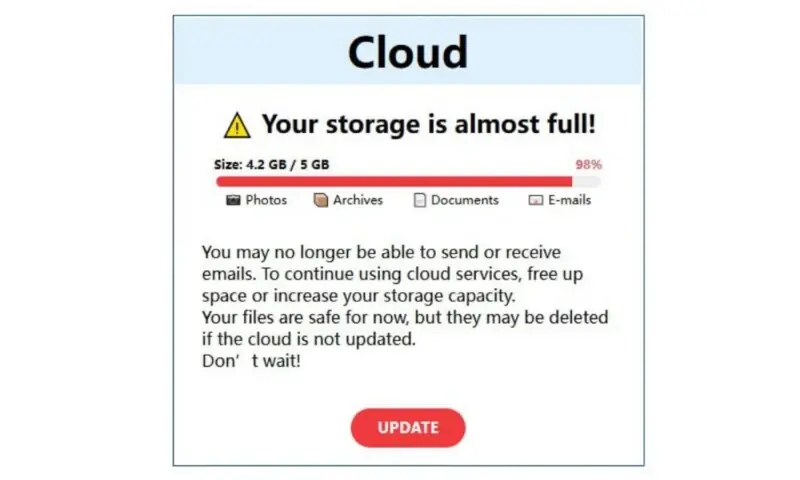 تقریباً ہر ای میل میں ایک بٹن شامل ہوتا ہے جس کے ذریعے صارف کو ادائیگی اپ ڈیٹ کرنے یا اسٹوریج مینج کرنے کا کہا جاتا ہے۔