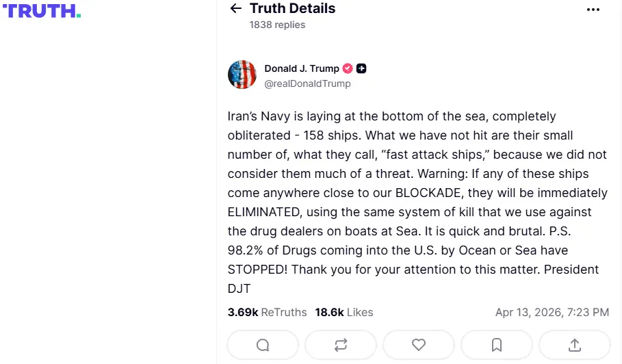 صدر کے مطابق اگر کوئی بھی جہاز مجوزہ بحری ناکہ بندی کے قریب آیا تو اس کے خلاف فوری کارروائی کی جائے گی اور اسے مکمل طور پر تباہ کیا جا سکتا ہے۔ انہوں نے اس عمل کو منشیات اسمگلنگ کے خلاف استعمال کیے جانے والے نظام سے تشبیہ دی۔