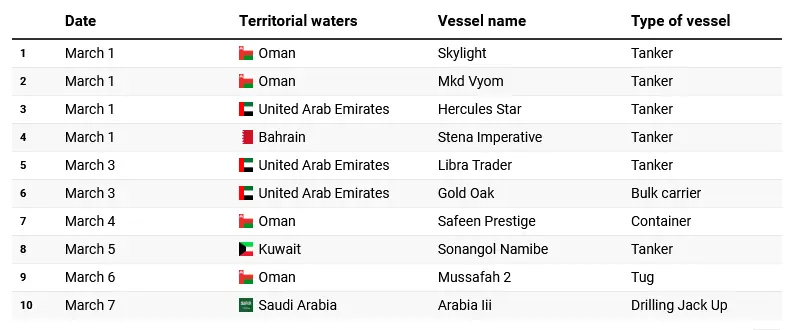 رپورٹ کے مطابق یکم مارچ کو عمان، متحدہ عرب امارات اور بحرین کے پانیوں میں کئی تیل بردار جہازوں پر حملے کیے گئے، جن میں Skylight، Mkd Vyom، Hercules Star اور Stena Imperative شامل ہیں۔