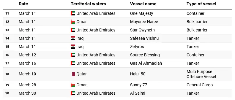 11 مارچ کو حملوں میں مزید شدت دیکھنے میں آئی جب متحدہ عرب امارات، عمان اور عراق کے پانیوں میں کئی جہاز نشانہ بنے۔ ان میں One Majesty، Mayuree Naree، Star Gwyneth، Safesea Vishnu اور Zefyros شامل ہیں، جو مختلف اقسام کے بحری جہاز تھے۔ اس کے اگلے روز 12 مارچ کو بھی متحدہ عرب امارات میں Source Blessing نامی کنٹینر جہاز پر حملہ رپورٹ ہوا۔