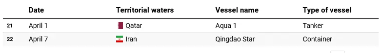 یکم اپریل کو قطر کے پانیوں میں Aqua 1 نامی تیل بردار جہاز کو نشانہ بنایا گیا، جسے میزائل حملے کا سامنا کرنا پڑا اور اسے جزوی نقصان پہنچا، تاہم عملہ محفوظ رہا۔ اس کے بعد 7 اپریل کو ایران کے قریب Qingdao Star نامی کنٹینر جہاز پر بھی حملہ رپورٹ ہوا، جس میں جہاز کو نقصان پہنچا لیکن کسی جانی نقصان کی اطلاع سامنے نہیں آئی۔