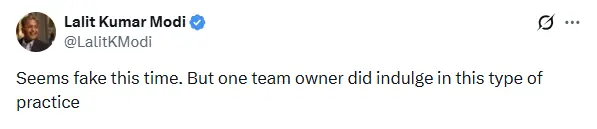 للت مودی نے اپنے بیان میں کہا کہ اس بار یہ جعلی لگتا ہے، لیکن ایک ٹیم کے مالک نے اس قسم کی سرگرمی (کالے جادو) میں ملوث ہونے کا مظاہرہ کیا تھا۔