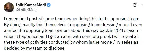 سابق آئی پی ایل چیئرمین نے مزید کہا کہ انہیں یاد ہے کہ انہوں نے 2011 کے سیزن میں بھی ایک ٹیم مالک کی جانب سے مخالف ٹیم کے ڈریسنگ روم میں اس طرح کی حرکت کرنے کے بارے میں اطلاع دی تھی اور اس حوالے سے انہوں نے مخالف ٹیم کے مالکان کو بھی خبردار کیا تھا۔