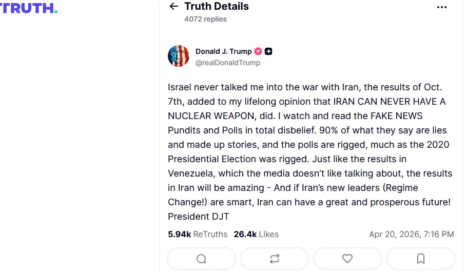 انہوں نے مزید کہا کہ وہ فیک نیوز کے تجزیہ کاروں اور رائے عامہ کے جائزوں پر یقین نہیں رکھتے اور ان کے مطابق ان میں سے 90 فیصد جھوٹ اور من گھڑت کہانیاں ہوتی ہیں۔ ٹرمپ نے یہ بھی دعویٰ کیا کہ رائے عامہ کے سروے بھی جعلی ہوتے ہیں، جیسے 2020 کے صدارتی انتخابات میں دھاندلی ہوئی تھی۔