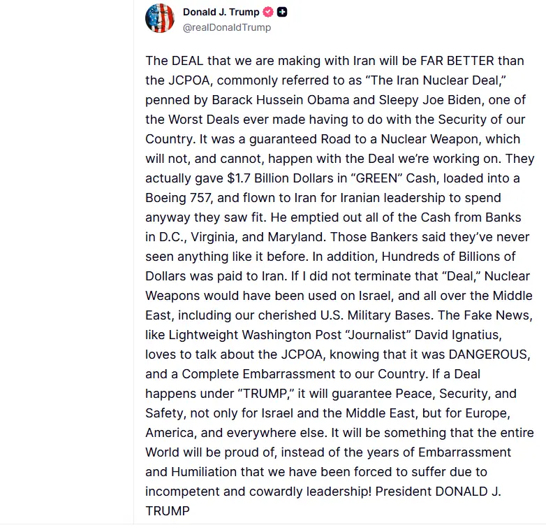 ٹرمپ نے الزام عائد کیا کہ ماضی میں ایران کو 1.7 ارب ڈالر نقد ایک بوئنگ 757 کے ذریعے منتقل کیے گئے، جب کہ ان کے مطابق یہ رقم ایرانی قیادت کو آزادانہ استعمال کے لیے دی گئی۔ انہوں نے مزید دعویٰ کیا کہ اس کے علاوہ بھی ایران کو سیکڑوں ارب ڈالرز ادا کیے گئے۔