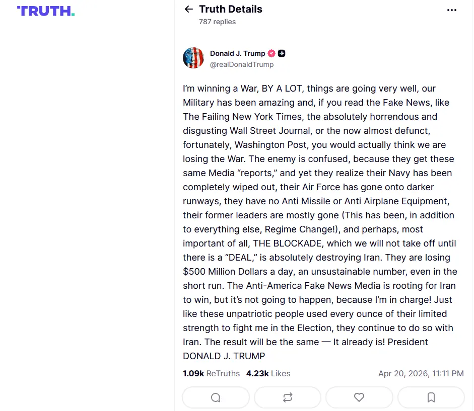 ٹرمپ کے مطابق زمینی حقیقت اس کے برعکس ہے اور امریکا بڑی برتری کے ساتھ آگے بڑھ رہا ہے، جب کہ ان کا دعویٰ ہے کہ ایران کی فوجی صلاحیتیں شدید کمزور ہو چکی ہیں۔ ایران کی بحری اور فضائی صلاحیتیں کمزور ہو چکی ہیں اور اس کے کئی رہنما منظرنامے سے ہٹ گئے ہیں، ایران کی معیشت کو روزانہ کروڑوں ڈالر کا نقصان پہنچا رہی ہیں۔