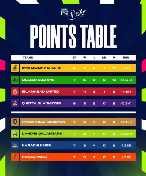 پشاور زلمی نے پلے آف مرحلے کے لیے پہلے ہی جگہ بنالی ہے جب کہ راولپنڈیز کی ٹیم ایونٹ سے باہر ہونے والی پہلی ٹیم بن گئی ہے۔