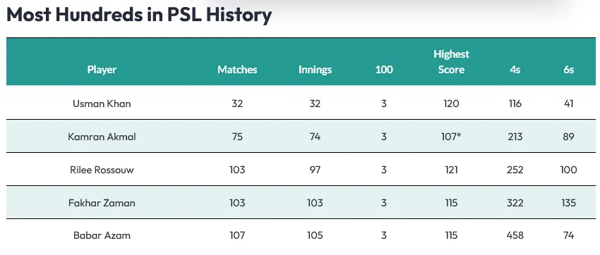 یہ ان کی پی ایس ایل میں تیسری سنچری ہے، جس کے ساتھ وہ لیگ میں تین سنچریاں بنانے والے مخصوص بیٹرز کے گروپ میں شامل ہو گئے ہیں۔ اس فہرست میں عثمان خان، کامران اکمل، رئیلی روسو اور بابر اعظم بھی شامل ہیں۔