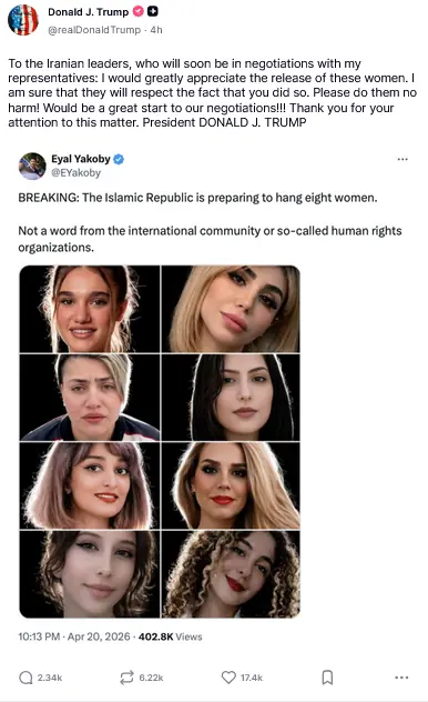 اس سے قبل صدر ٹرمپ نے اپنے سوشل میڈیا پلیٹ فارم سوشل ٹروتھ پر ایک اسرائیل کے حمایتی ایکٹوسٹ کی پوسٹ شیئر کرتے ہوئے ایرانی قیادت کے نام پیغام جاری کیا۔ اپنے بیان میں انہوں نے کہا کہ یہ ایران کے رہنماؤں کے نام، جو جلد ہی میرے نمائندوں کے ساتھ مذاکرات میں شامل ہونے والے ہیں، میں ان خواتین کی رہائی کو بہت سراہوں گا۔