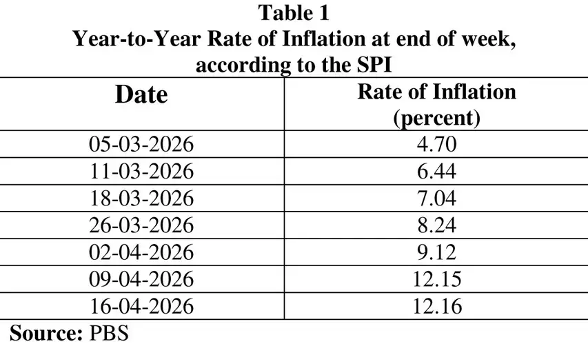 اس اشاریے کے مطابق 16 اپریل تک سالانہ بنیاد پر مہنگائی کی شرح بڑھ کر دو ہندسوں میں 12.2 فیصد تک پہنچ گئی ہے۔ گزشتہ چھ ہفتوں کے دوران اس میں تیزی سے اضافہ ہوا ہے، جیسا کہ جدول 1 میں ظاہر کیا گیا ہے۔