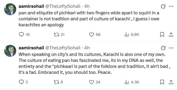 انہوں نے کہا کہ کراچی میں سب سے زیادہ نظر آنے والی چیز “پان کی پچکاریاں” ہیں اور اس کے بغیر شہر کی درست نمائندگی نہیں ہوتی۔