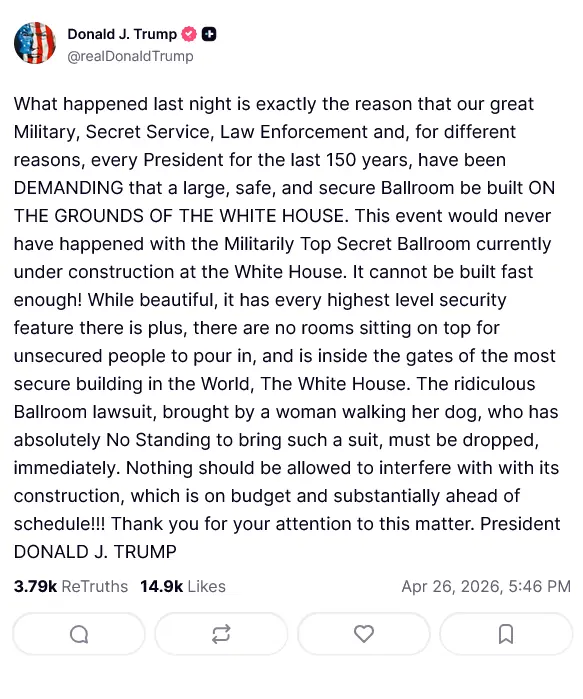 اتوار کے روز سوشل میڈیا پلیٹ فارم ٹروتھ سوشل پر جاری اپنے بیان میں امریکی صدر ڈونلڈ ٹرمپ نے کہا کہ گزشتہ رات جو واقعہ پیش آیا اس کی اصل وجہ یہی ہے کہ ہماری عظیم فوج، سیکرٹ سروس، قانون نافذ کرنے والے ادارے اور مختلف وجوہات کی بنا پر گزشتہ 150 برس کے دوران ہر صدر نے اس بات پر زور دیا کہ وائٹ ہاؤس کے اندر ایک بڑا، محفوظ اور سیکیور بال روم تعمیر کیا جائے۔