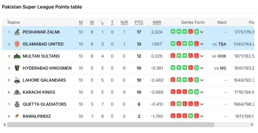خیال رہے کہ 17 پوائنٹس کے ساتھ پشاور زلمی کی ٹیم نے گروپ میں پہلی پوزیشن جب کہ 13 پوائنٹس کے ساتھ اسلام آباد یونائیٹڈ کی دوسری پوزیشن رہی۔