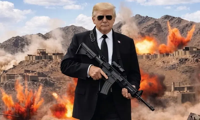 اس پوسٹ کے ساتھ ’اے آئی‘ سے تیار کردہ ایک تصویر بھی شامل ہے جس میں ڈونلڈ ٹرمپ کے ہاتھ میں بندوق ہے، پس منظر میں دھماکے اور تباہی کی عکس بندی کی گئی ہے اور تصویر پر انگریزی میں عبارت درج ہے کہ ’اب شرافت دکھانے کا وقت نہیں بچا‘۔