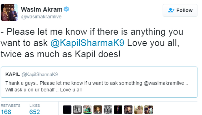 کپل کے ٹوئٹ کے جواب میں وسیم نے ایک اور ٹوئٹ کرتے ہوئے اپنے مداحوں سے مخاطب کرتے ہوئے کہا ہے کہ میں کپل کے شو میں شرکت کرنے والا ہوں اگر کسی کو کپل کے بارے میں کچھ بھی جاننا ہو تو مجھے بتائیں۔
