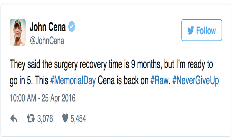 جان سینا نے اپنے ٹویٹ میں کہا کہ ڈاکٹروں نے انجری کو ٹھیک ہونے کیلئے نو مہینے کا وقت دیا تھا لیکن میں پانچ مہینے بعد ہی واپسی کیلئے تیار ہوں۔