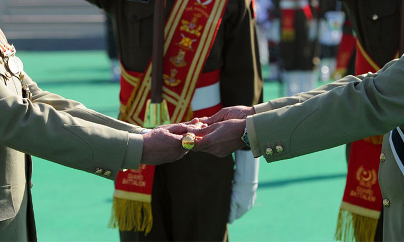 چھڑی کی حوالگی کے بعد جنرل راحیل شریف اور ہلال امتیاز جنرل قمرجاوید باجوہ نے ایک دوسرے کو سیلیوٹ کیا۔سبزہلالی پرچم تھامے آرمی کے تینوں ریجمنٹس نے آرمی چیف جنرل قمرجاوید باجوہ کو سلامی پیش کی۔