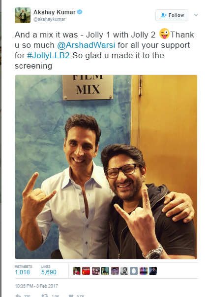 سماجی رابطے کی ویب سائٹ ٹوئٹر پر اکشے کمار نے ارشد کے ساتھ ایک تصویر جاری کرتے ہوئے پیغام دیا کہ جولی 1 اور 2 ایک ساتھ ہیں ، جولی 2 کی سپورٹ کرنے کیلئے ارشد وارثی کا شکر گزار ہوں ، بہت خوشی کی بات ہے کہ آپ نے اس کو اسکرین پر کامیاب ہونےکا موقع دیا۔