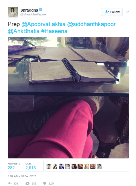 فائل فوٹوبولی وڈ اسٹار شردھا کپور آج کل نئی فلم ' حسینہ ' کے حوالے سے مصروف ہیں ۔ میڈیارپورٹس کے مطابق شردھا نے سماجی رابطےکی ویب سائٹ ٹوئٹر پر ایک تصویر جاری کی ، جس میں وہ فلم ' حسینہ' کیلئے تیاری کر رہی ہیں۔