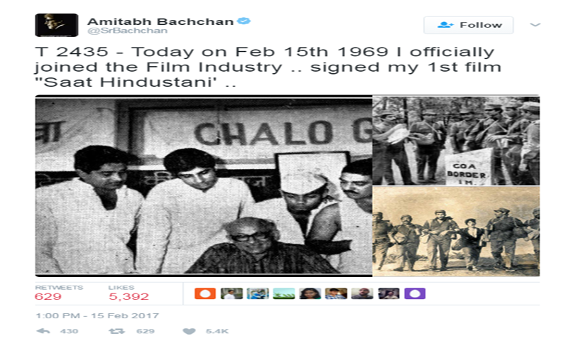 ٹوئٹرٹوئٹر پر جاری اپنے پیغام میں چند تصاویر کے ساتھ ان کا کہنا تھا کہ میں باقاعدہ فلم انڈسٹری میں 15 فروری 1969 میں آیا تھا اور میری پہلی فلم ' سات ہندوستانی' تھی۔