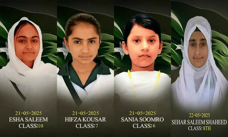 شہدا میں چھٹی جماعت کی ثانیہ سومرو(بائیں سے پہلی)، ساتویں جماعت کی حفظہ کوثر (بائیں سے دوسری)، آٹھویں جماعت کی سحر سلیم (بائیں سے تیسری) اور دسویں جماعت کی عیشا سلیم (بائیں سے چوتھی) شامل ہیں